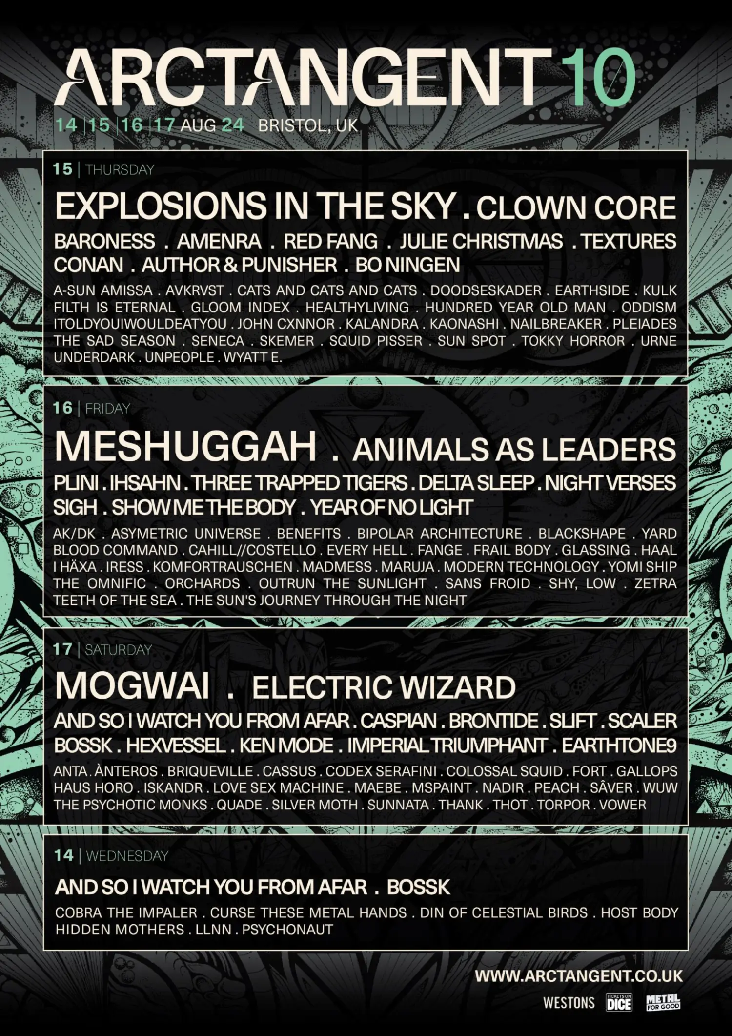 The 2024 lineup contains 117 acts. Explosions In The Sky, Clown Core, Meshuggah, Animals As Leaders, Mogwai and Electric Wizard headline the festival.