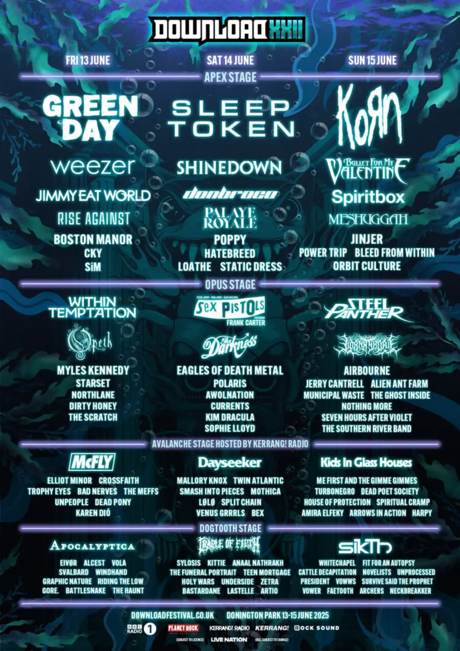 The 2025 lineup contains 110 acts. Green Day, Sleep Token and Korn headline the festival.