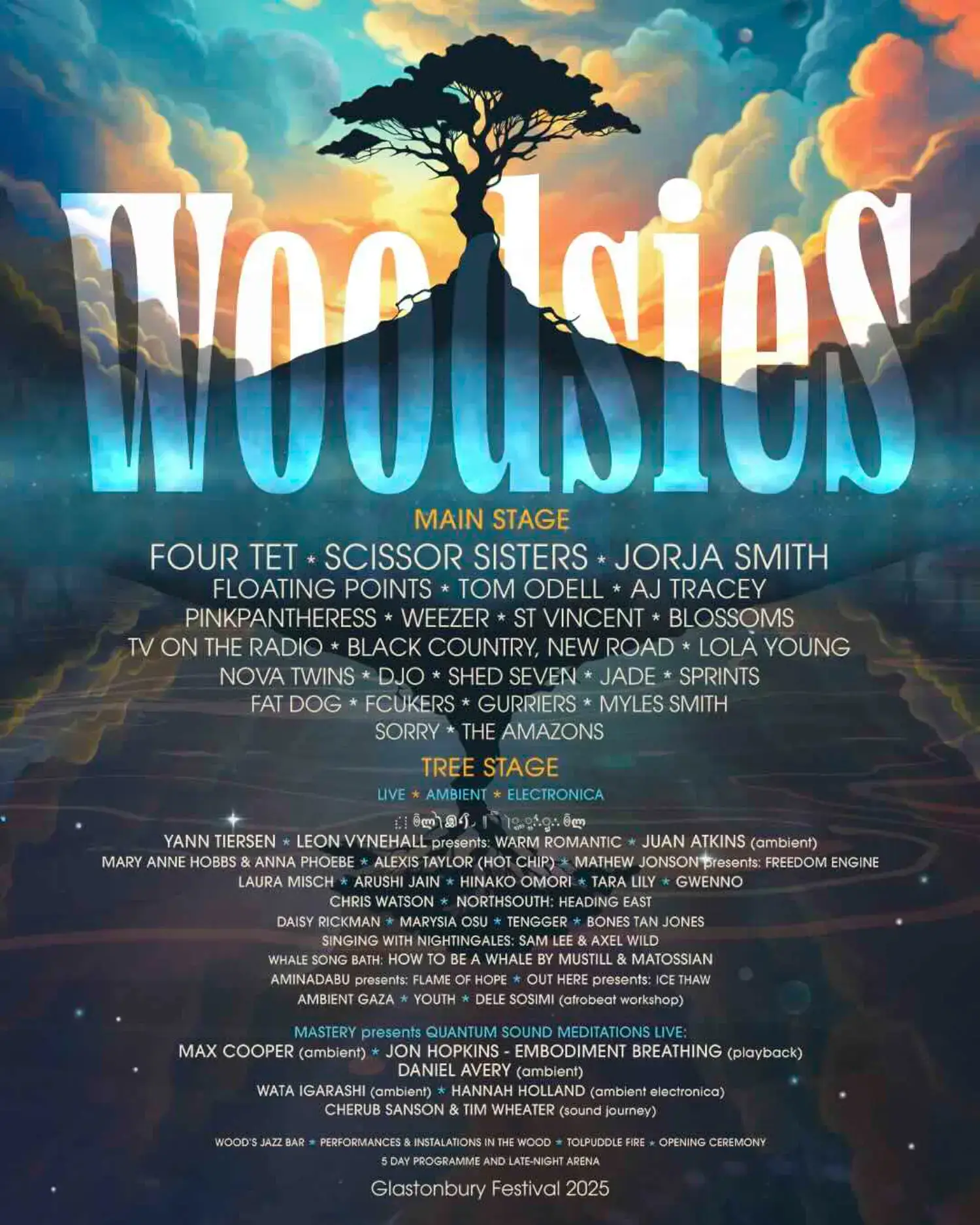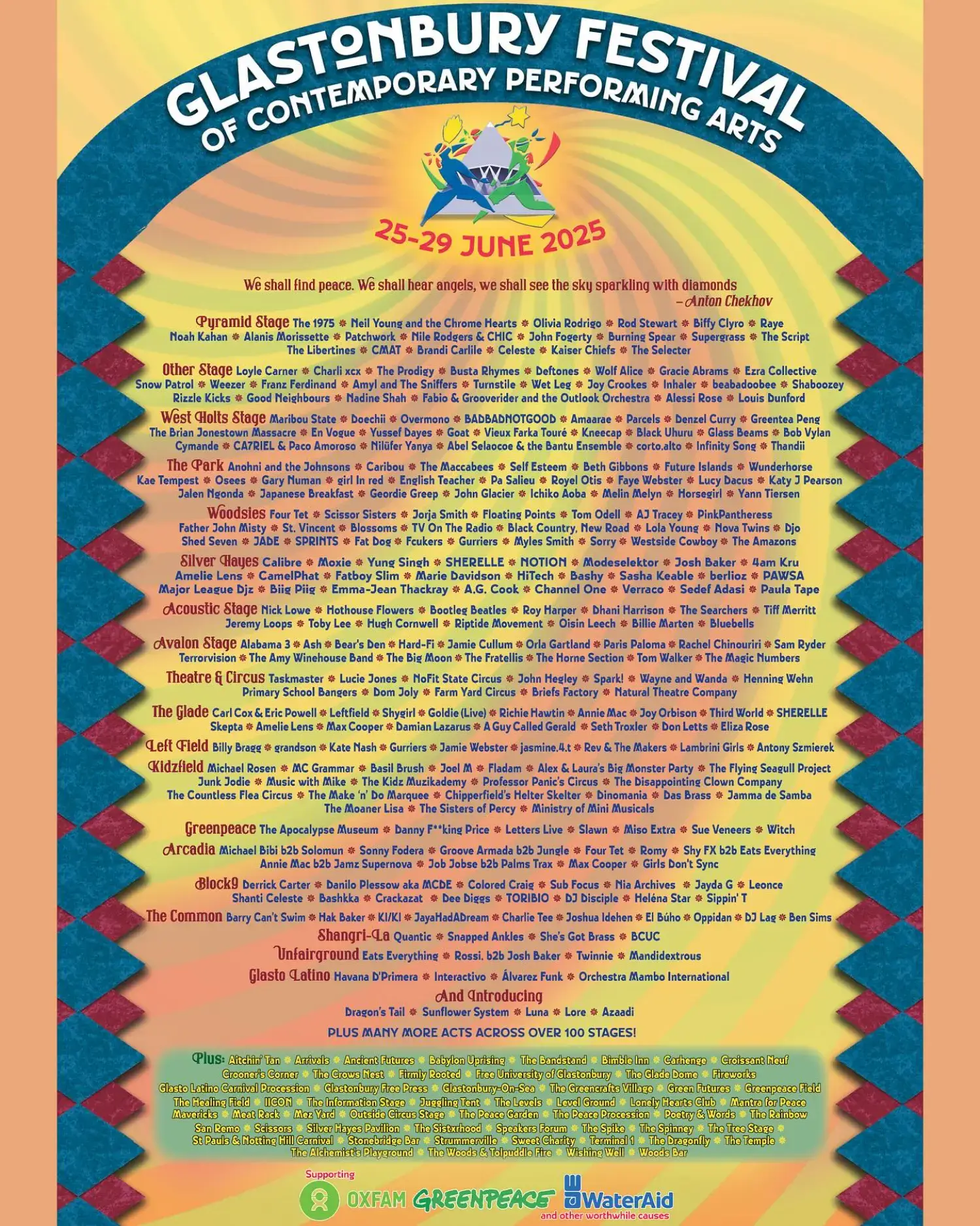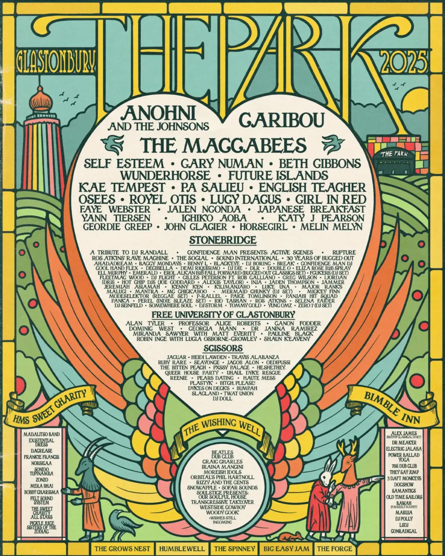 The 2025 lineup contains 830 acts. The 1975, neil young and the chrome hearts, Antony and the Johnsons, Caribou, Doechii, Overmono, Four Tet, Scissor Sisters and Jorja Smith headline the festival.