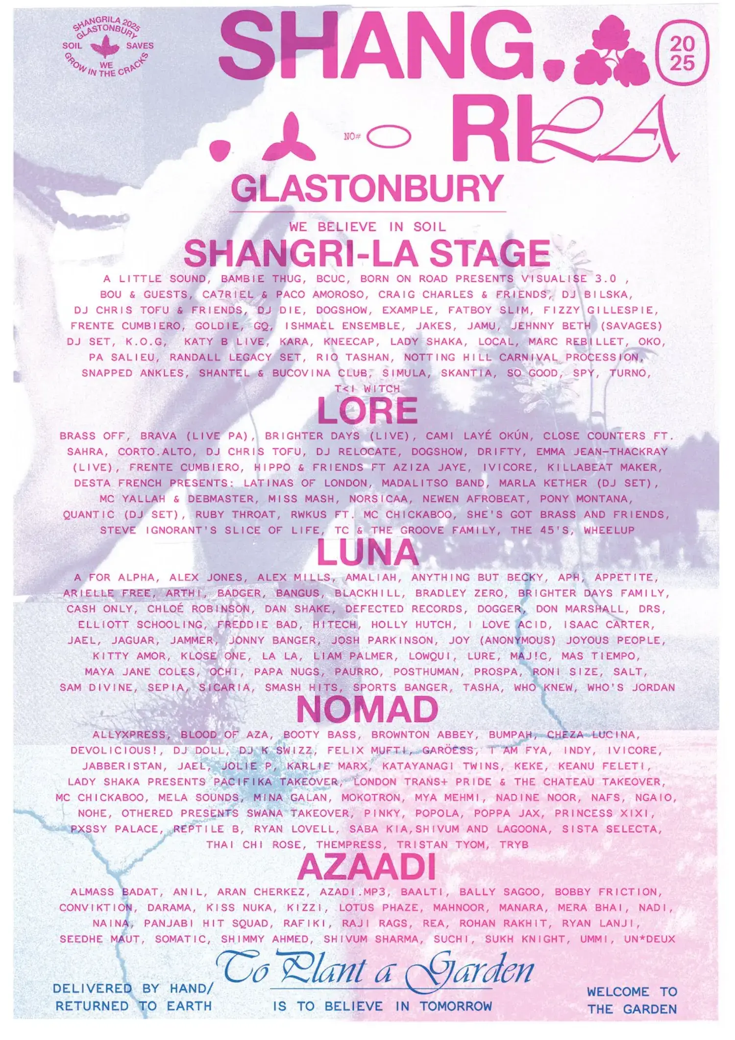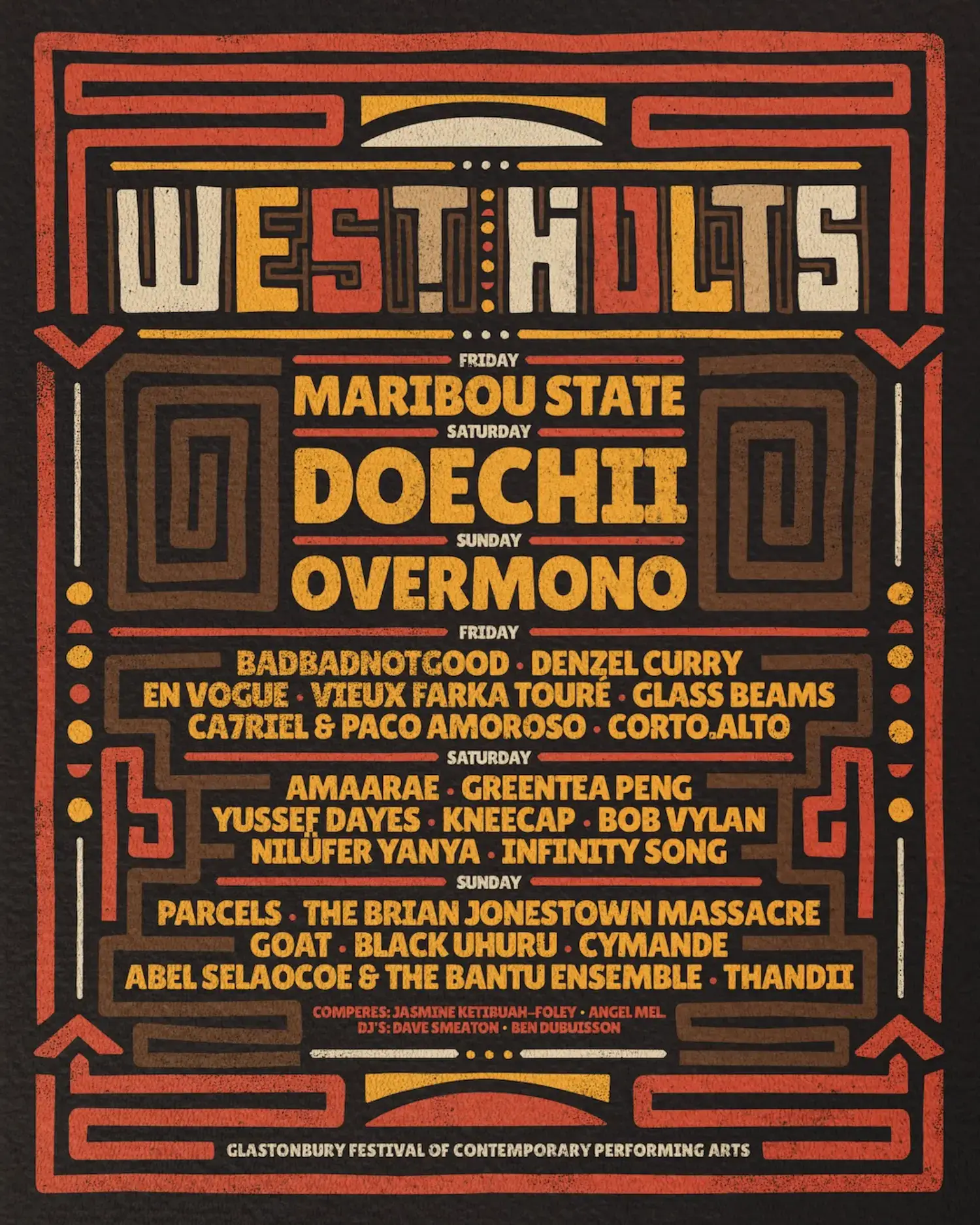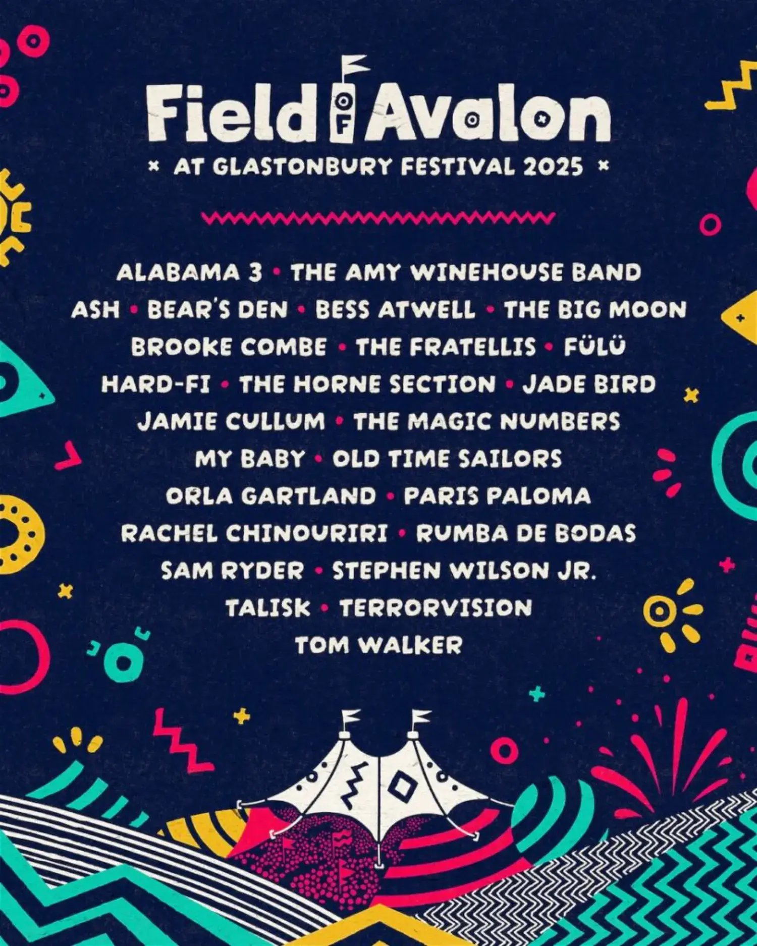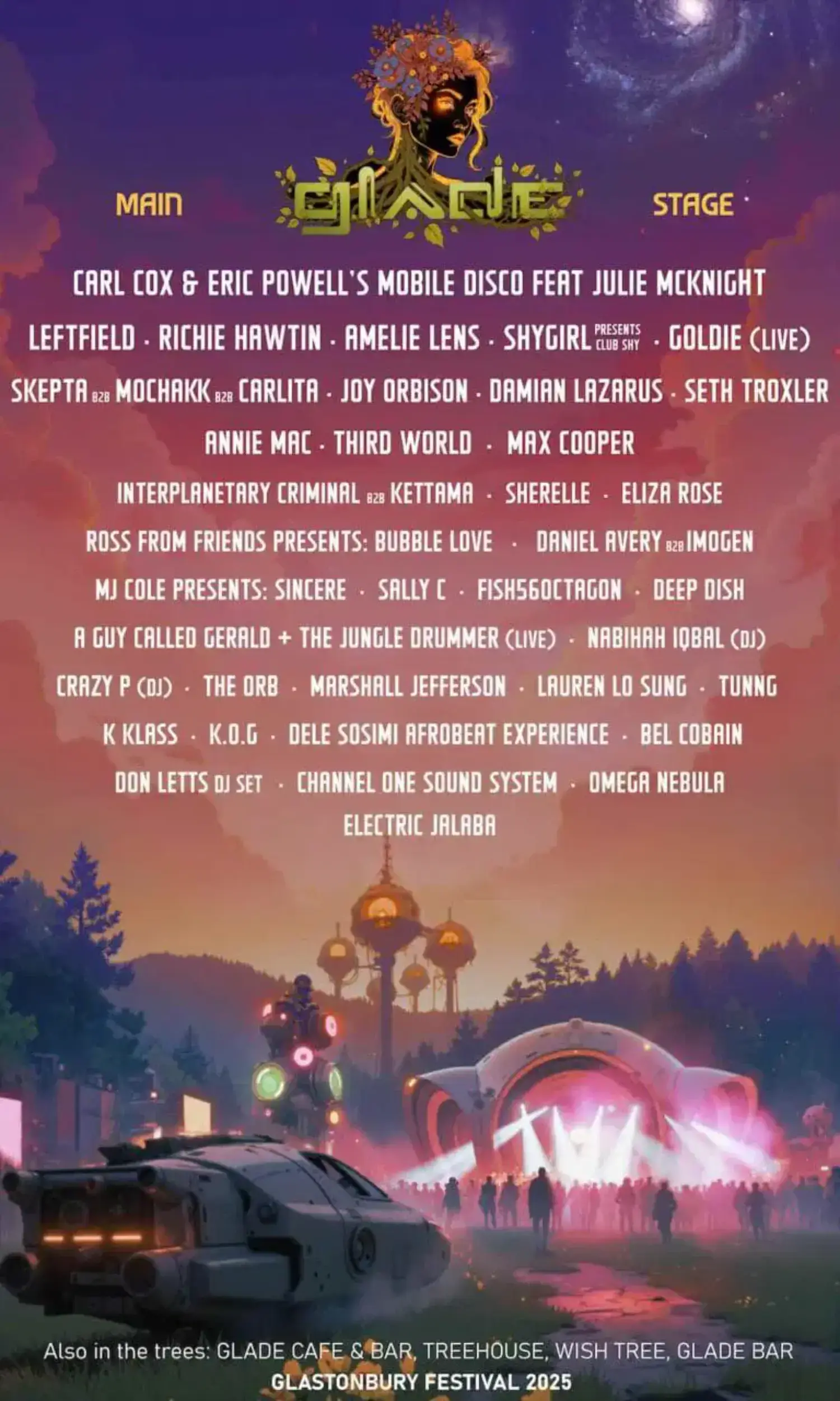 The 2025 lineup contains 830 acts. The 1975, neil young and the chrome hearts, Antony and the Johnsons, Caribou, Doechii, Overmono, Four Tet, Scissor Sisters and Jorja Smith headline the festival.