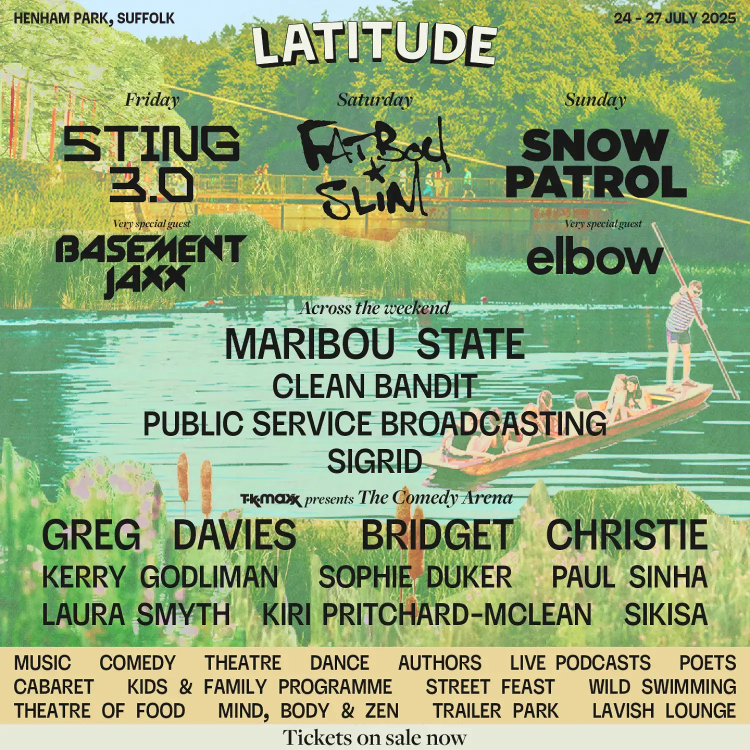 The 2025 lineup contains 16 acts. ; Sting, Fatboy Slim and Snow Patrol top the bill as headliners headline the festival.