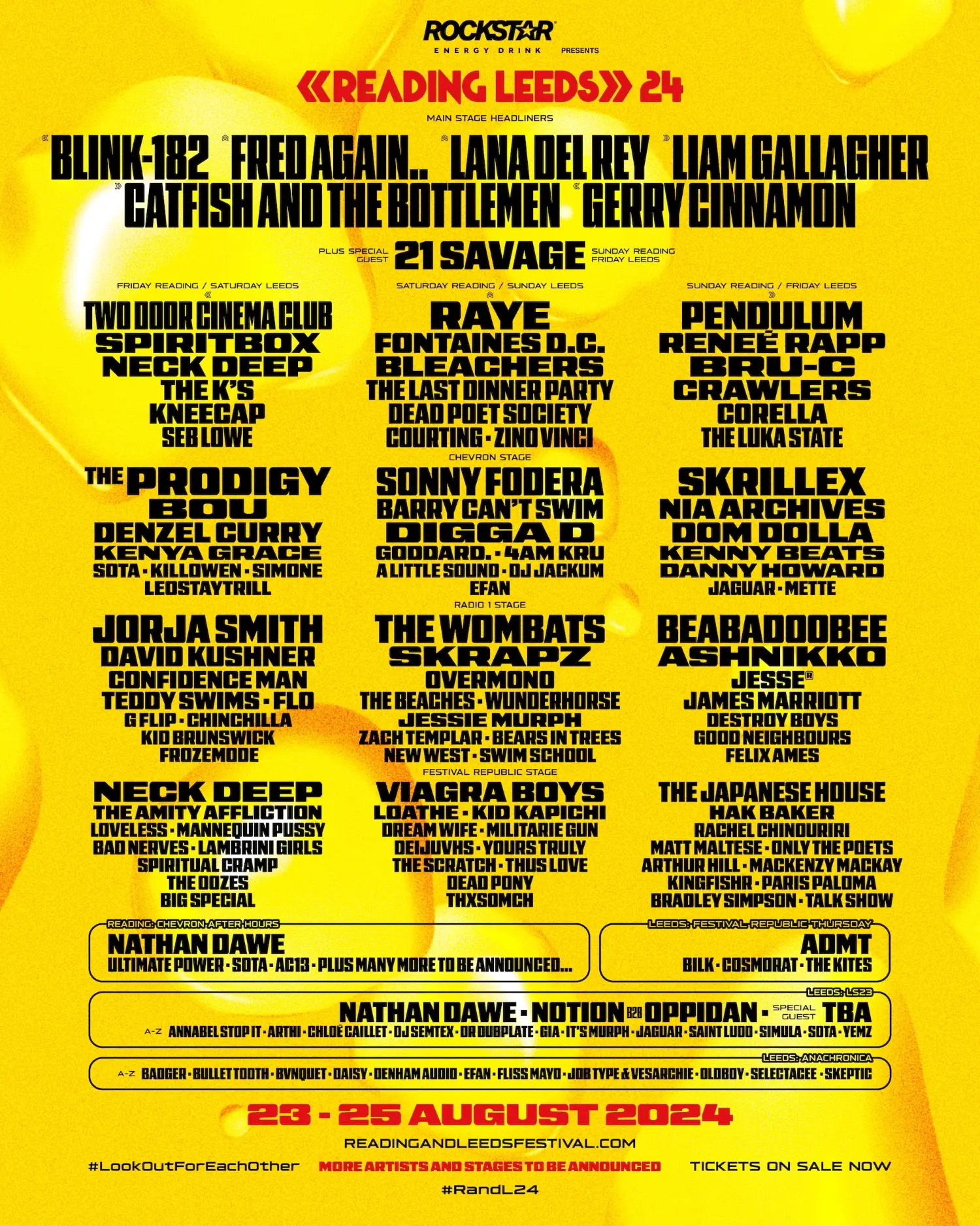 The 2024 lineup contains 132 acts. blink-182, Fred again.., Lana Del Rey, Liam Gallagher, Catfish and the Bottlemen, Gerry Cinnamon and 21 Savage headline the festival.