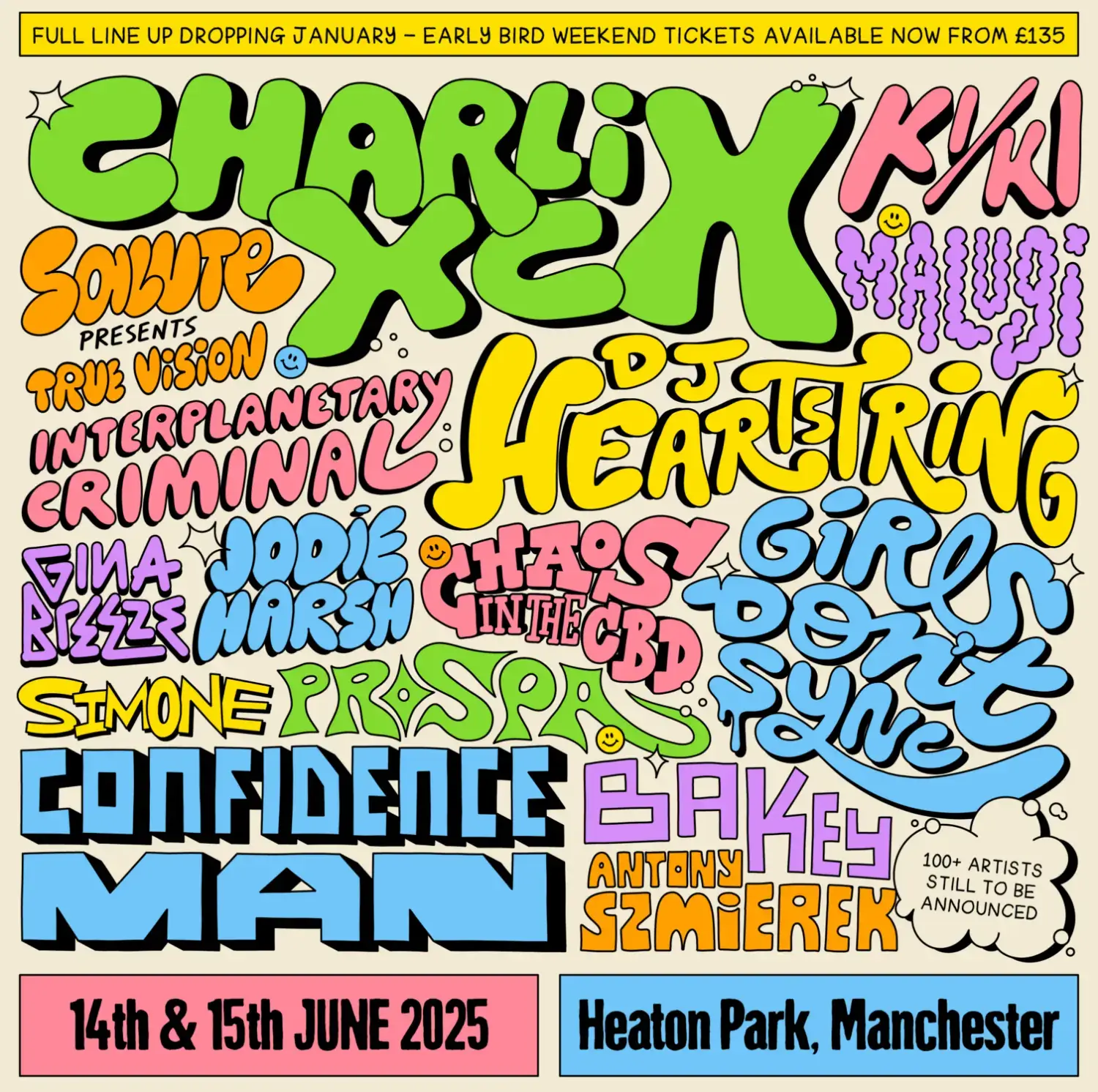 The 2025 lineup contains 15 acts. ; Charli XCX, Kyki, Malugi, DJ Heartstring and Confidence Man top the bill as headliners headline the festival.