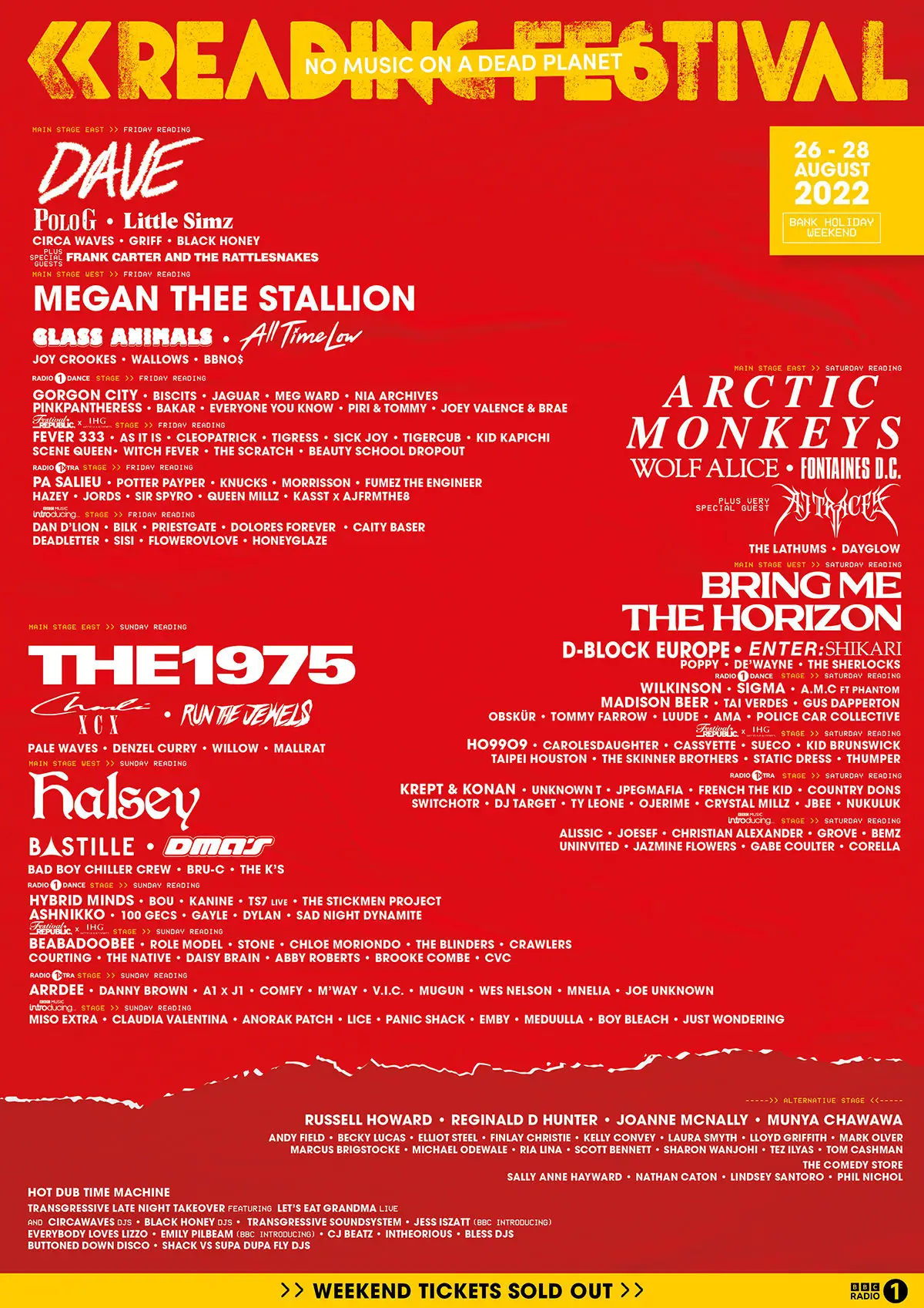 The 2022 lineup contains 193 acts. Dave, Megan Thee Stallion, Arctic Monkeys, Bring Me The Horizon, The 1975 and Halsey headline the festival.