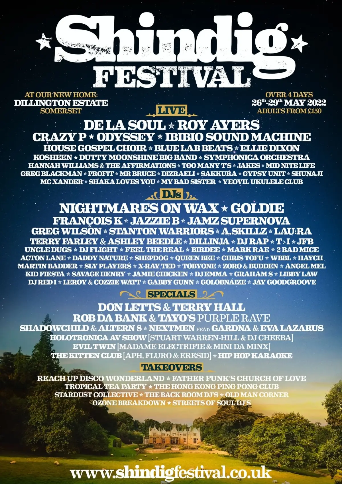 This image is courtesy of Shindig festival, showing you which acts are scheduled for 2022.