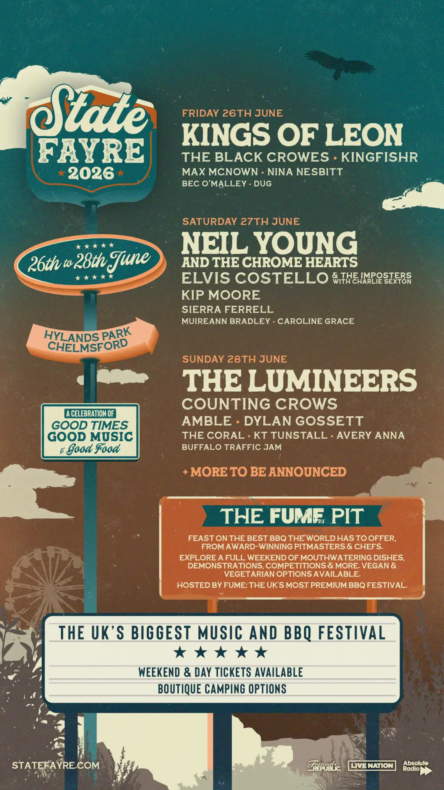 The 2026 lineup contains 23 acts. Kings of Leon, neil young and the chrome hearts and The Lumineers headline the festival.