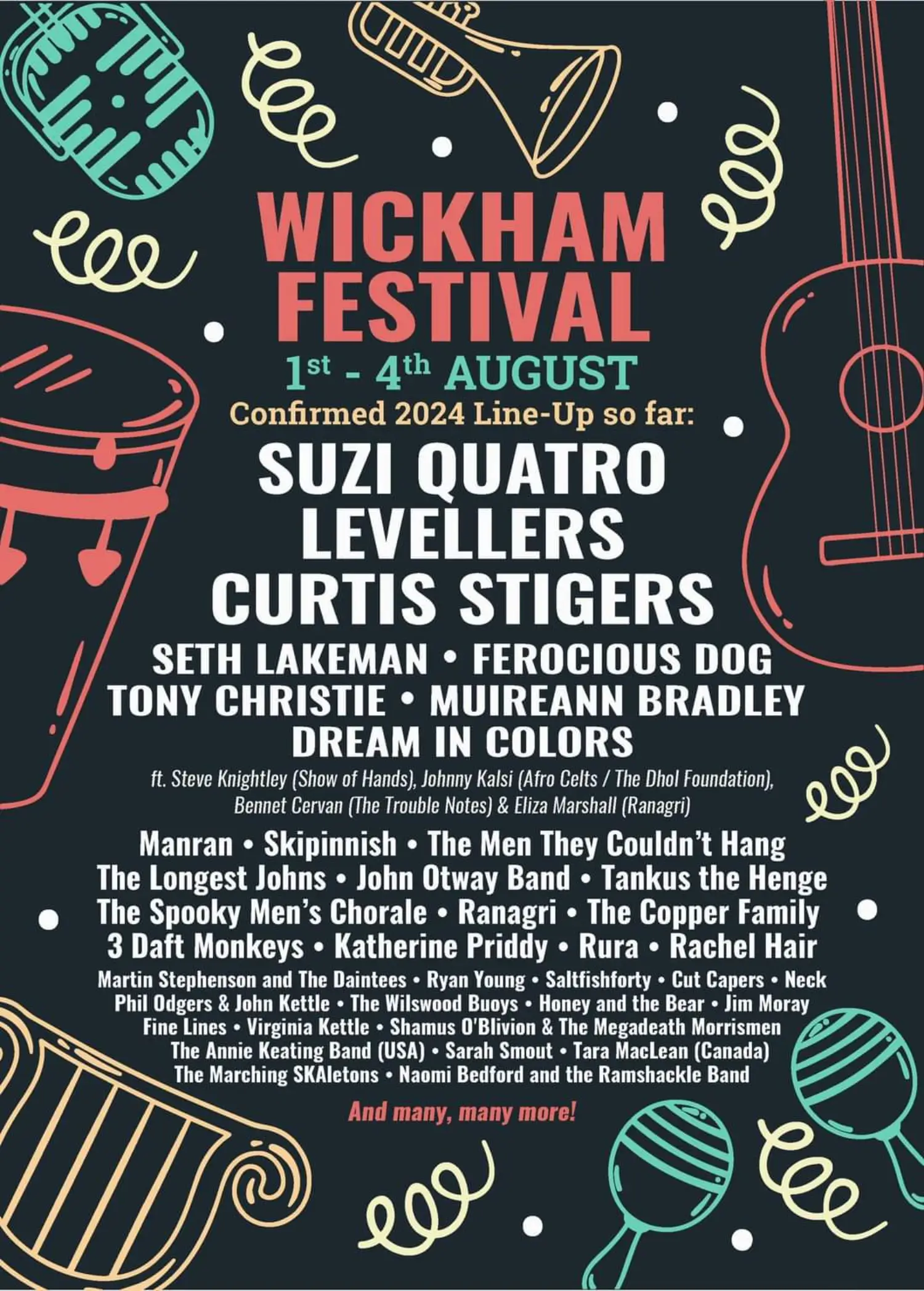 This image is courtesy of Wickham festival, showing you which acts are scheduled for 2024.