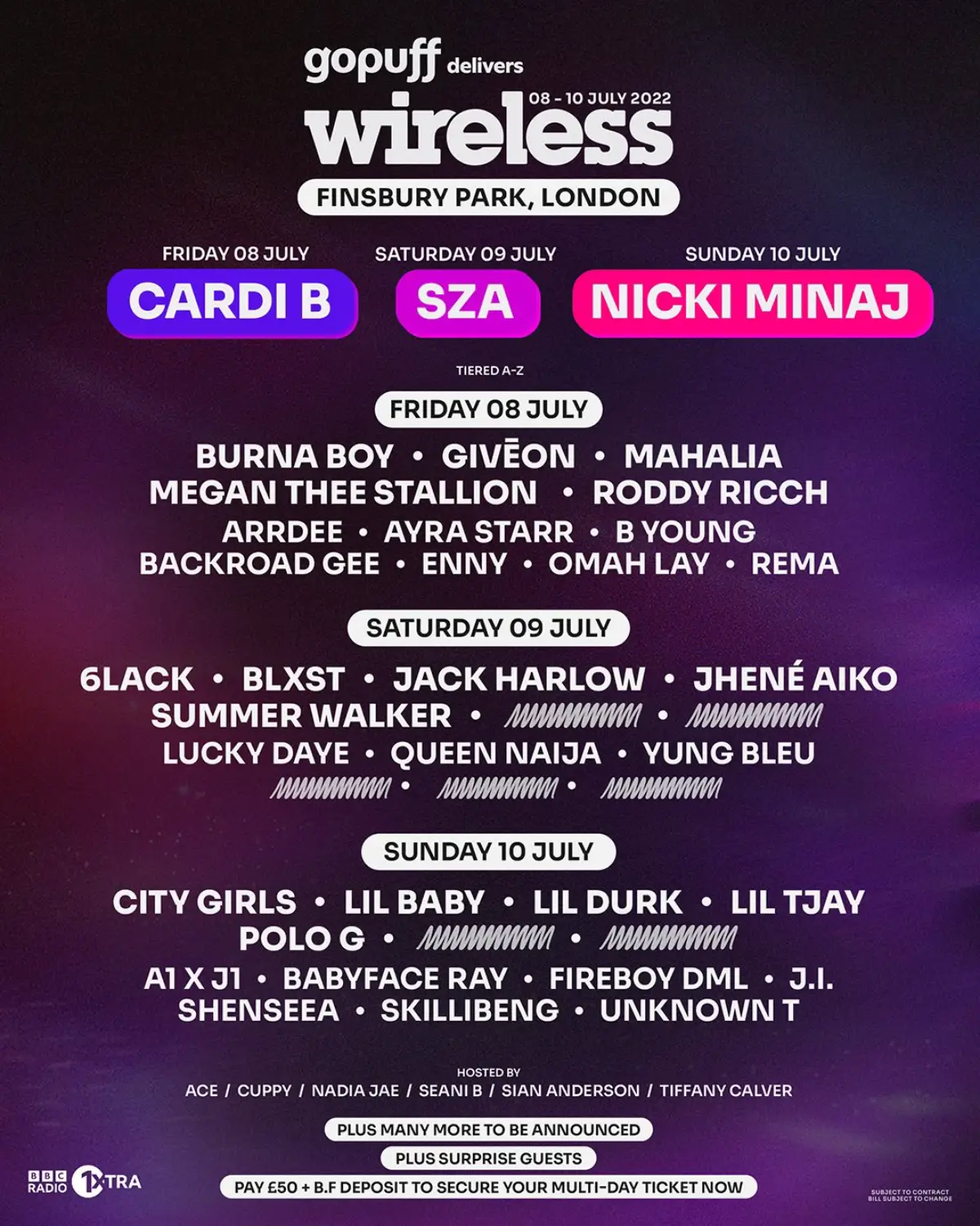 The 2022 lineup contains 36 acts. Cardi B, SZA and Nicki Minaj headline the festival.