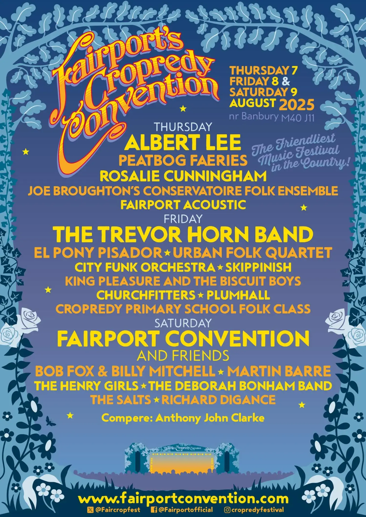 The 2025 lineup contains 21 acts. ; Albert Lee, The Trevor Horn Band and Fairport Convention top the bill as headliners headline the festival.